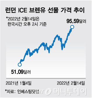 특히 사우디아라비아, 러시아 등 주요 산유국으로 구성된 협의체 석유수출국기구 플러스(OPEC+)가 미국, 인도 등 원유 소비국의 요구에도 추가 증산에 나서지 않으면서 석유 가격 상승세를 부추겼다. 여기에 세계 3위 산유국인 러시아가 우크라이나 분쟁으로 원유 생산에 차질이 생길 거란 전망이 시장을 지배하면서 이제 100달러에도 근접한 상태다.