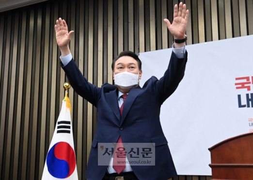 팔 번쩍 - 윤석열 국민의힘 대선후보가 14일 국회에서 ‘국민과 함께 승리하겠습니다’라는 주제로 열린 의원총회에서 모두발언을 한 뒤 양팔을 들고 인사하고 있다.김명국 선임기자 |