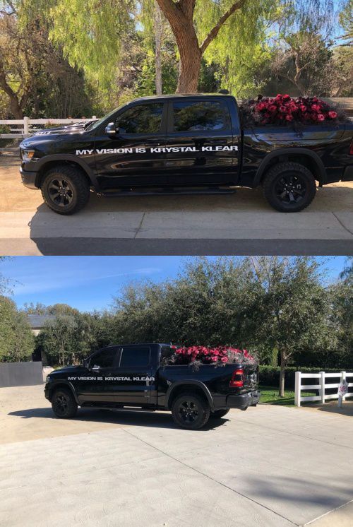 공개된 사진 속에는 역시 'MY VISION IS KRYSTAL KLEAR'란 글이 쓰여져 있는 검은 트럭의 모습이 담겨져 있다. 트럭 인에는 장미가 가득하다.