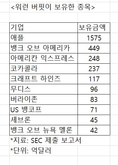 버크셔가 가장 많이 보유하고 있는 10대 종목의 투자 규모는 셰브론 외에는 변함없이 유지됐다.