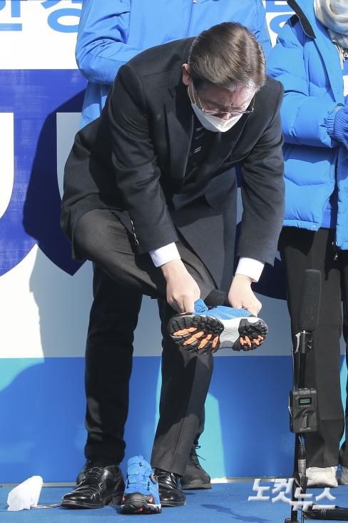 더불어민주당 이재명 대선후보가 제20대 대선 공식선거운동이 시작된 15일 오전 부산 진구 부전역 앞 유세차량에 올라 지지자들에게 운동화를 받고 있다.