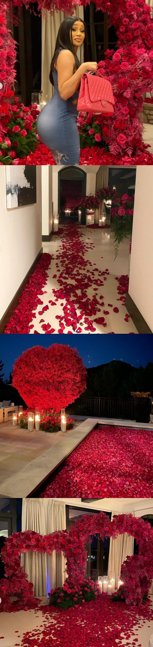 이와 함께 카비디의 SNS에는 장미꽃으로 가득한 집과 수영장 등의 모습이 담겨져 있어 감탄을 자아낸다. 꽃길과 장미꽃 잎으로 채워진 수영장은 아름다우면서도 플렉스의 끝을 보여주는 듯 하다. 카디비는 빛나는 샤넬백을 든 채 워킹을 선보이기도 했다. 카디비는 "너무 행복하다"라며 오프셋에게 고마운 감정을 표현했다.