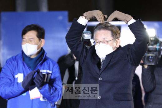 이재명(오른쪽) 더불어민주당 대선후보가 15일 서울 고속터미널역 앞 유세에서 두 팔로 하트 모양을 만들어 인사하고 있다. 정연호 기자 |