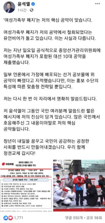 윤 후보는 “일부 언론에서 가정에 배포되는 선거 공보물에 위 공약이 빠졌다고 지적했다”며 “하지만 이는 홍보 수단의 특성에 따른 맞춤형 전략일 뿐”이라고 밝혔다. 윤 후보는 “저 윤석열이 그동안 국민 여러분께 말씀드린 짧은 메시지에 저의 진심이 담겨 있다”며 “많은 국민께서 호응해 주신 그 내용이야말로 저의 핵심 공약들”이라고 했다. 윤 후보는 “청년이 내일을 꿈꾸고 국민이 공감하는 공정한 사회를 반드시 만들어내겠다”며 “우리 함께 정권교체 갑시다”라고 썼다.