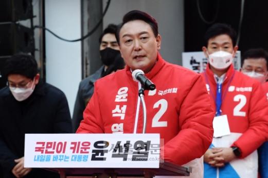 윤석열 국민의힘 대선 후보가 15일 오후 부산시 부산진구 서면 젊음의거리에서 ‘청년이 함께하는’ 공정과 상식의 시대! 부산 거점유세를 하고 있다.2022 .2. 15 김명국 선임기자 |