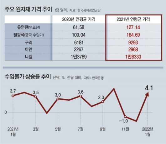 원자재 가격 상승에 따라 수입물가도 올랐다. 이날 한은의 ‘2022년 1월 수출입물가지수’에 따르면 원재료가 전달 대비 8.2% 올랐다. 특히 원유가 15.0%, 광산품이 9.0% 뛰었다. 수입물가는 시차를 두고 소비자물가에 반영돼 서민 부담이 불어날 것으로 우려된다.