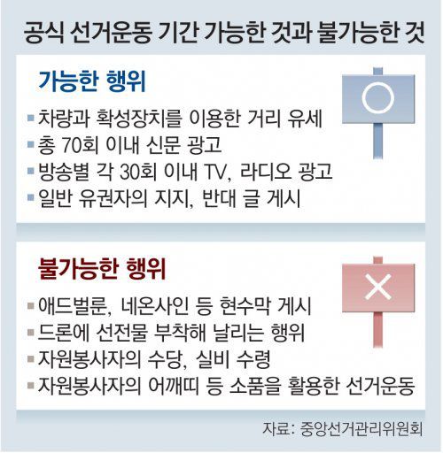 후보들은 다음 달 7일까지 총 70회 이내로 소속 정당의 정강·정책이나 후보의 정견, 정치자금 모금 등에 관해 신문 광고를 낼 수 있다. TV 및 라디오 광고의 경우 선거 전날인 다음 달 8일까지 방송별 각 30회 이내에서 가능하다.