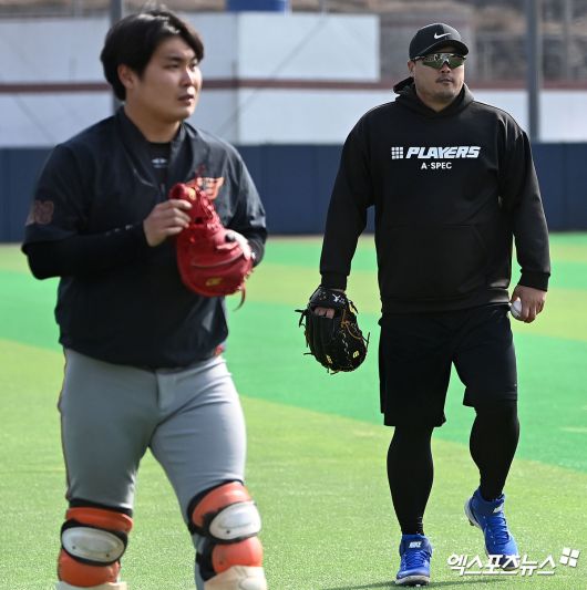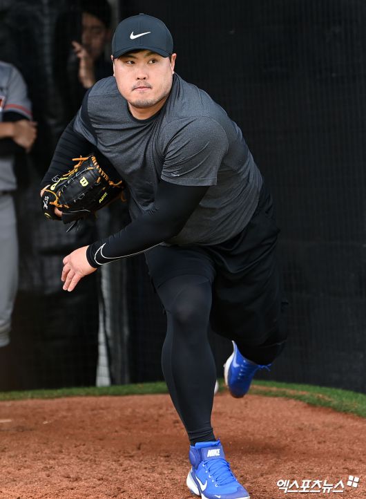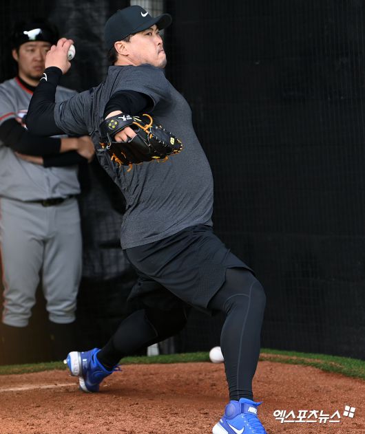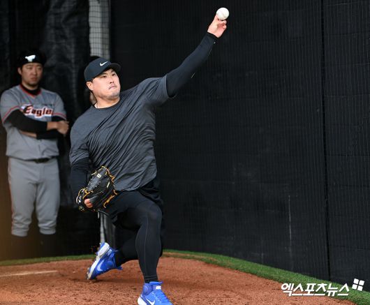 14일 오후 경남 거제시 하청스포츠타운에서 진행된 한화 스프링캠프, 이날 한화 투수들의 불펜피칭이 마무리가 될 쯤 류현진이 글러브를 챙겨 피칭 준비를 시작했다. 그러자 불펜 주변에는 투수들 뿐만 아니라 타자들과 정민철 단장, 손혁 투수 코디네이터도 류현진의 불펜 피칭을 보기위해 자리를 잡았다.
