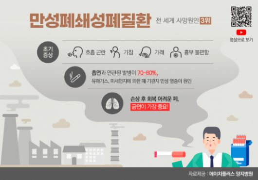 에이치플러스 양지병원 손지영 호흡기센터장은 “COPD의 초기증상은 호흡곤란, 기침, 가래, 흉부 불편함과 담답함 등이 생기고 중증이 되면 기침, 가래가 늘어나고, 감기에 걸렸을 때 회복속도가 느려지거나 숨이 차고 쉽게 피곤해지는 증상이 나타난다”고 설명했다.