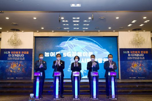 임혜숙 과학기술정보통신부 장관이 지난해 11월 서울 영등포구 루나미엘레에서 열린 '지하철 Wi-Fi 28㎓(기가헤르츠) 백홀 실증결과 발표 및 농어촌 5G 공동이용망 시범상용화 개시 행사' 에 참석했다. 사진은 황현식 LG유플러스 대표(왼쪽부터), 홍석준 국회의원, 임혜숙 과기정통부 장관, 구현모 KT 대표, 유영상 SK텔레콤 대표가 '농어촌 5G 상용화' 기념촬영을 하고 있는 모습. /과학기술정보통신부 |