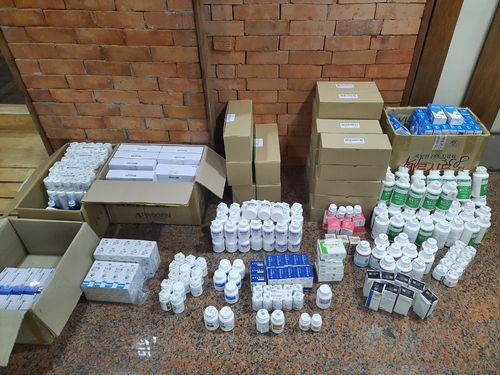 "코로나19 신속 대응 TF"의 의료지원팀에서 분류 중인 코로나19 관련 각종 의약품·2022.2.15. [미얀마 한인교회 제공] |