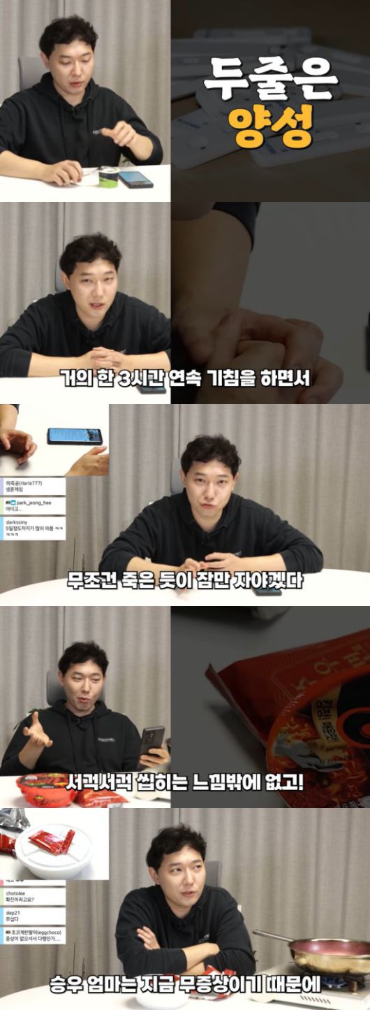 승우아빠는 "승우 엄마는 무증상이라 승우와 함께 있다"라고 전하며 "증상으로는 엄청난 기침과 열, 오한, 몸살 기운, 두통, 미각 손실, 식욕 감퇴가 있다. 3일 동안 먹은 게 거의 없다. 과일 말고는 아무것도 먹고 싶지가 않았다. 탄산을 좋아하는데 생존 본능이 깨어난 건지 따뜻한 물을 찾게 되더라"라고 말했다.