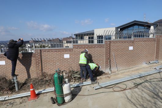 16일 오전 대구 달성군 유가읍 쌍계리 박근혜 전 대통령 사저로 알려진 주택 담장 주변 가드레일 해체작업이 진행되고 있다. 대구=뉴스1 |