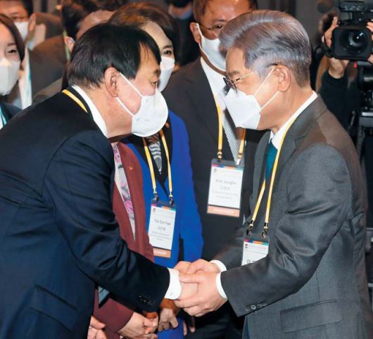 이재명·윤석열, 후보 선출후 첫 만남 - 더불어민주당 이재명(오른쪽) 대선 후보와 국민의힘 윤석열(왼쪽) 후보가 10일 서울 그랜드워커힐서울에서 열린 한 포럼에 참석해 인사하고 있다. 두 사람은 후보 선출 후 처음 대면했다. /국회사진기자단 |