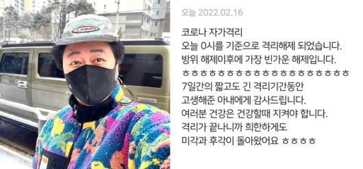 16일 윤택은 인스타그램에 “코로나 자가격리 오늘 0시를 기준으로 격리해제 됐다. 방위 해제 이후에 가장 반가운 해제다. 7일간의 짧고도 긴 격리 기간 동안 고생해준 아내에게 감사하다. 여러분 건강은 건강할 때 지켜야 한다. 격리가 끝나니까 희한하게도 미각과 후각이 돌아왔다. 격리 해제일 : 검체 채취일로부터 7일차 24:00시(=8일차 0시) 자동 격리해제(별도의 통지 없이 자동 해제로 PCR검사 필요 없음, 해제통지서 발급되지 않음)”이라는 게시글을 게재했다.