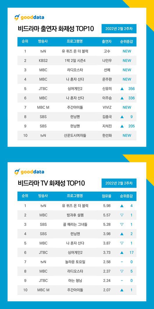 [OSEN=하수정 기자] 2월 2주차 비드라마 화제성 1위는 tvN ‘유 퀴즈 온 더 블럭’이 차지했다. ‘재야의 특집’ 편에 등장한 게스트들이 고루 화제 되며 전주 대비 화제성 86.68% 상승했다. 그 중 설악산 지게꾼 임기종 씨의 사연에 네티즌의 가장 큰 주목이 발생했으며, ‘존경스럽다’는 반응이 쏟아졌다. 비드라마 출연자 화제성 부문 고수가 1위에 올랐다.