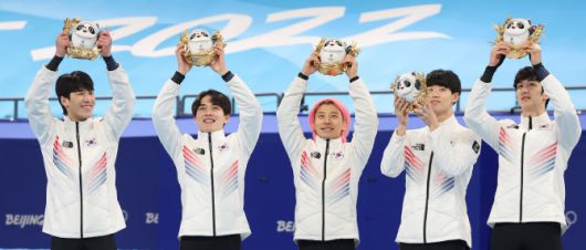16일 중국 베이징 캐피털 실내 경기장에서 열린 2022 베이징 동계올림픽 쇼트트랙 남자 5000m 계주 결승에서 은메달을 획득한 대한민국 남자 쇼트트랙 대표팀이 시상대에서 기념촬영을 하고 있다.(사진=연합뉴스) |