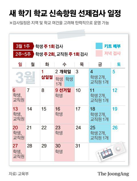 새 학기 학교 신속항원 선제검사 일정. 그래픽=김은교 kim.eungyo@joongang.co.kr |