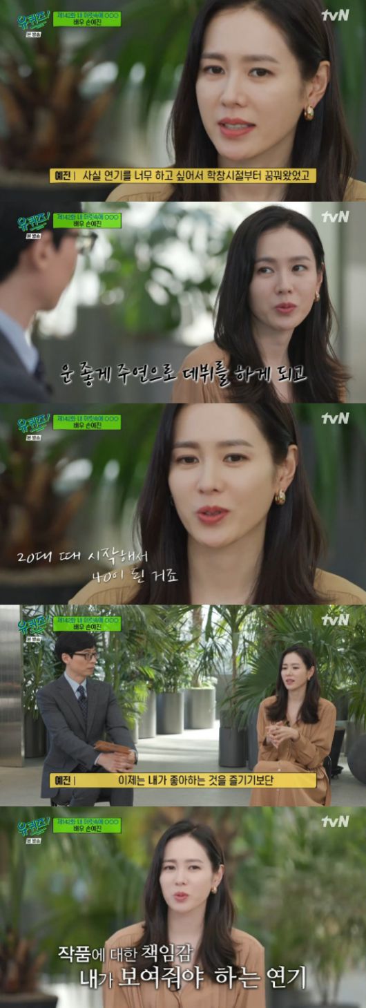 특히 유재석은 "'연기를 해보니까 이 길이 내 길이다. 잘 선택했다'라는 생각이 들었냐"라며 질문을 던졌고, 손예진은 "연기를 너무 하고 싶어서 학창 시절부터 꿈꿔왔었고 운 좋게도 데뷔작도 주인공으로 시작을 했고 20년이란 시간이 눈 깜짝하니까 이렇게 되어 있다. 20대에서 시작해서 40대가 된 거다"라며 회상했다.