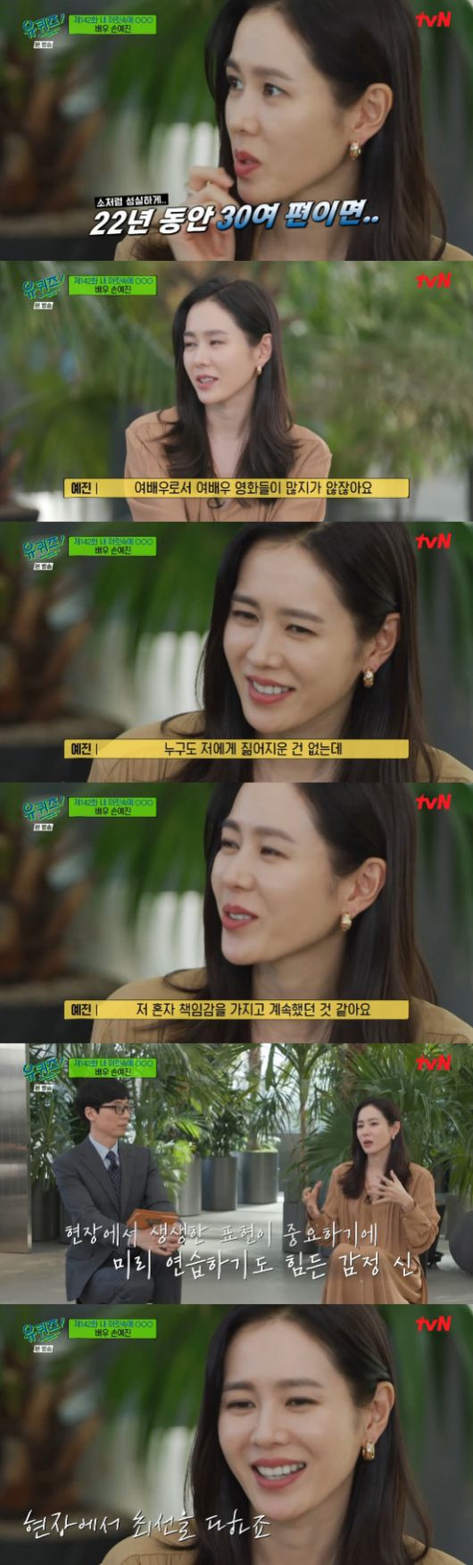 또 유재석은 "데뷔 후에 하나도 쉬지 않고 출연작만 30편이라고 한다"라며 감탄했고, 손예진은 "22년 했는데 30편 했으면 얼마나 많이 한 거냐. 하나도 안 쉰 것 같다. 여배우로서 여배우 영화가 많지 않다. 누구도 저에게 짊어지운 건 없는데 혼자 책임감을 가지고 계속 그렇게 했던 것 같다"라며 밝혔다.