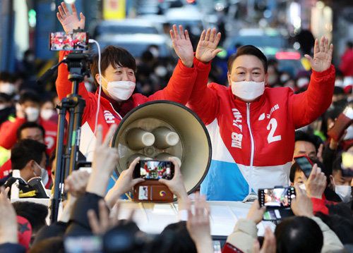윤석열 국민의힘 대선후보는 유세2일차 광주 송정매일시장앞에서 연설을 마치고 지지자들의 환호에 답례 하고 있다. 광주=사진공동취재단 |