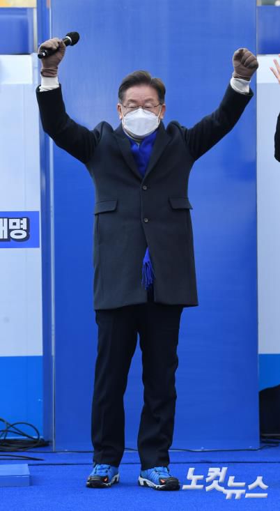 더불어민주당 이재명 대선 후보가 17일 오후 서울 청계광장에서 지지를 호소하고 있다.