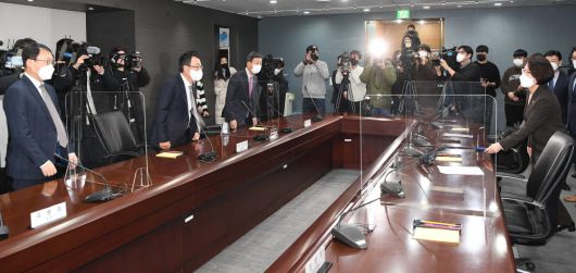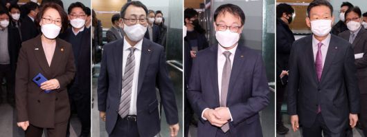 5세대(5G) 이동통신 주파수 3.4~3.42㎓ 대역 할당 논의를 위한 '과학기술정보통신부-통신3사 CEO 간담회'가 17일 서울 중구 포스트타워에서 열렸다. 왼쪽부터 유영상 SKT 대표, 구현모 KT 대표, 황현식 LG유플러스 대표.
