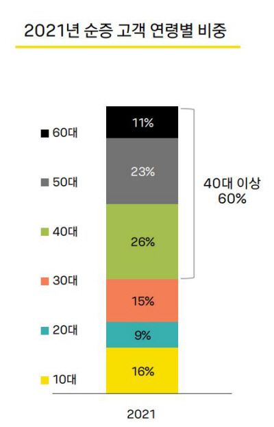 17일 카카오뱅크에 따르면 지난해 말 기준 카카오뱅크 고객 수는 1799만명으로, 전년 대비 255만명 증가했다. 신규 고객을 연령대별로 보면 40대 이상이 60%를 차지했다. 40대가 전체 신규 고객의 26%, 50대 23%, 60대 이상이 11%였다.