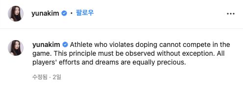 한편 한국 피겨의 전설 김연아도 소셜네트워크서비스를 통해 이번 사태에 대한 입장을 우회적으로 드러냈다.