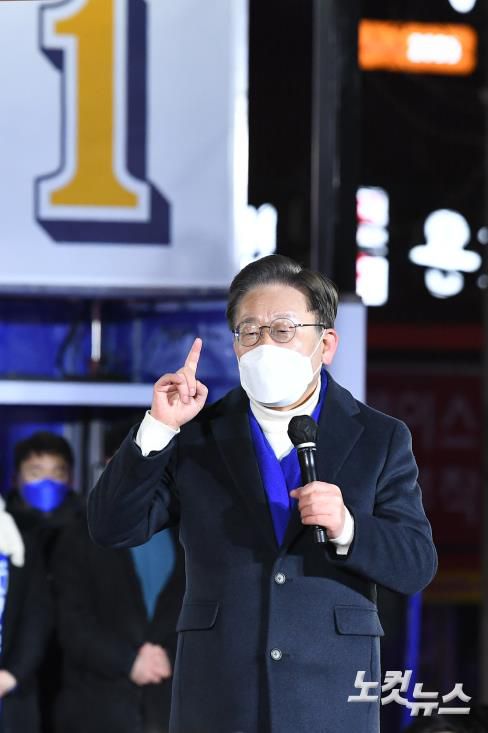 이재명 더불어민주당 대선 후보가 17일 오후 서울 마포구 홍대 상상마당 앞에서 '이제는 청년이다! 청년기회국 유세'를 하며 시민들에게 지지를 호소하고 있다.