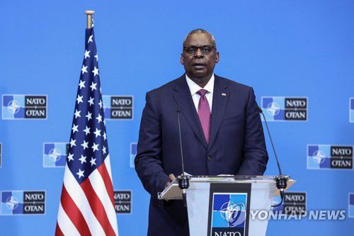 (브뤼셀 AFP=연합뉴스) 로이드 오스틴 미국 국방장관이 17일(현지시간) 벨기에 브뤼셀에서 열린 북대서양조약기구 국방부 장관회의에서 기자회견을 하고 있다. 2022.2.17 photo@yna.co.kr |
