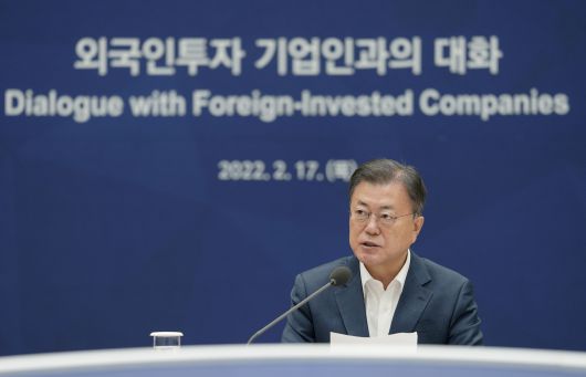 문재인 대통령이 17일 오전 청와대 영빈관에서 열린 외국인투자기업인과의 대화에 참석, 발언하고 있다. 2022.2.17 /연합뉴스 |