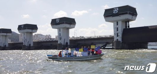 낙동강하구기수생태계복원협의회 회원들이 지난 2019년 9월17일 오전 부산 사하구 낙동강 하굿둑 앞에서 수문개방을 찬성하는 퍼포먼스를 벌이고 있다. 환경부 등 관계기관은 이날 오전 9시50분부터 1시간가량 낙동강 하굿둑 8번 수문을 열고 바닷물 120만t 가량을 유입시켰다. (낙동강하구기수생태계복원협의회 제공) 2019.9.17/뉴스1 |