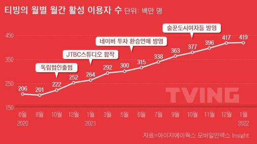 CJ ENM은 18일 온라인 동영상 서비스(OTT) 자회사 티빙이 2500억원 규모의 외부 투자 유치에 성공했다고 밝혔다. 기업가치는 지난해 7월 네이버의 투자 당시 인정받았던 3500억원의 6배 수준인 약 2조원으로 늘었다.