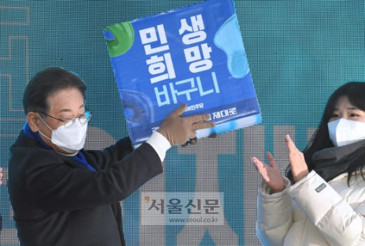 ‘민생 희망 바구니’ 받고 - 이재명 더불어민주당 대선후보가 17일 서울 노원구 상계동 롯데백화점 노원점 앞 유세차량 위에서 ‘민생 희망 바구니’를 전달받고 있다.정연호 기자 |