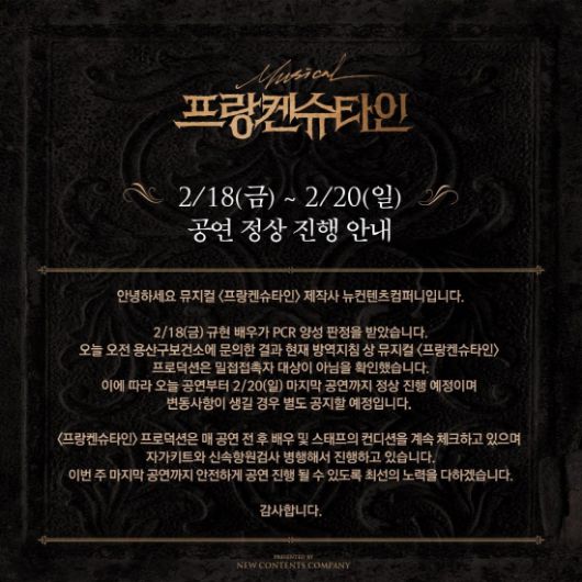 18일 뮤지컬 '프랑켄슈타인' 제작사 뉴컨텐츠컴퍼니는 "규현 배우가 PCR 양성 판정을 받았다. 오늘 오전 용산구보건소에 문의한 결과 현재 방역지침 상 '프랑켄슈타인' 프로덕션은 밀접접촉자 대상이 아님을 확인했다"라고 밝혔다.