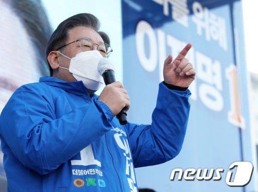 (목포=뉴스1) 오대일 기자 = 이재명 더불어민주당 대선 후보가 18일 오후 전남 목포시 평화광장에서 열린 '김대중 대통령님, 그립습니다' 목포 거리유세에서 연설하고 있다. 공식 선거운동이 시작된 이후 처음으로 호남을 찾은 이 후보는 전통 지지기반인 순천, 목포, 나주, 광주를 훑으며 표심잡기에 나선다. 2022.2.18/뉴스1 |