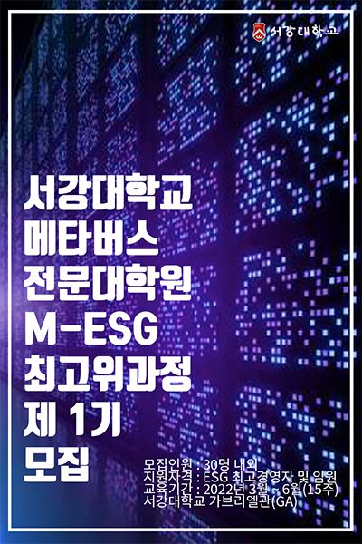 디지털 전환을 주도하는 서강대학교가 메타버스전문대학원을 통해 메타버스 ESG(M-ESG) 최고경영자(CEO) 교육과정을 모집한다.