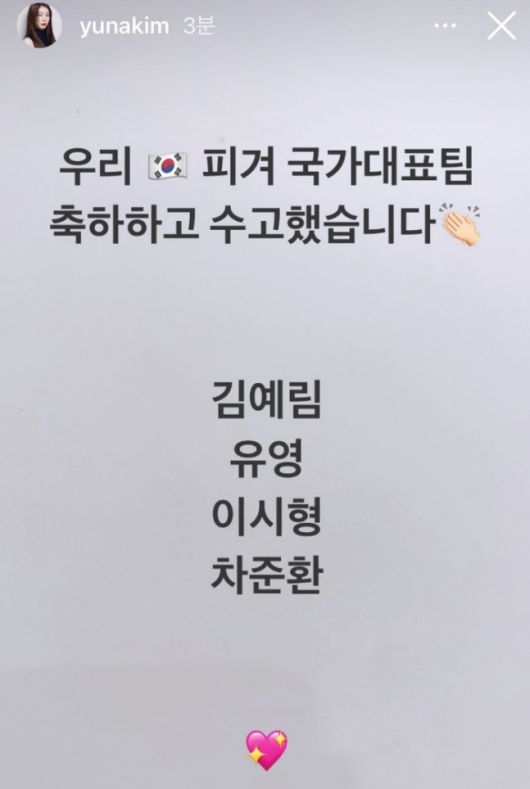 김연아는 18일 개인 SNS에 "우리 피겨 국가대표팀 축하하고 수고했다"는 게시물을 올렸다. 특히 이번 올림픽에 출전한 남자 싱글의 차준환(21) 이시형(22, 이상 고려대)과 여자 싱글 유영(18) 김예림(19, 이상 수리고)의 이름을 나열했다.