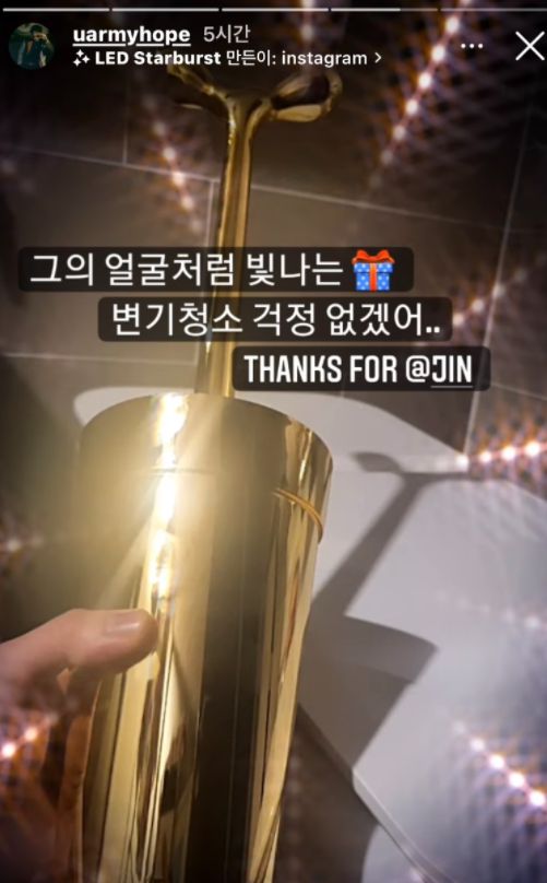 이어 화룡점정인 선물을 공개했는데, 변기 옆에서 번쩍이는 황금 변기솔이 그것이었다. 제이홉은 "그의 얼굴처럼 빛나는 선물, 변기청소 걱정 없겠어"라는 글로 많은 팬들을 즐겁게 했다.