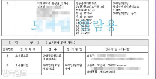 박근혜 전 대통령의 대구 사저 등기부 등본. 부동산 등기 열람용 화면 캡처. |