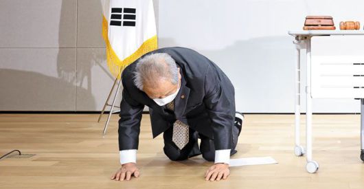 '김원웅 집행부' 광복회 부회장 무릎꿇고 사과… 일부 회원 "쇼하지 말라" - 18일 서울 여의도 광복회관에서 소집된 광복회 임시총회에서 공금 횡령의혹으로 김원웅 전 회장이 사퇴하면서 직무를 대행하고 있는 허현 부회장이 무릎을 꿇고 사과하고 있다. /연합뉴스 |