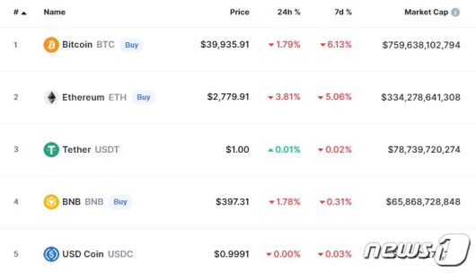 비트코인은 19일 오전 7시 10분 현재(한국시간 기준) 글로벌 코인시황 중계사이트인 코인마켓캡에서 24시간 전보다 1.79% 하락한 3만9935달러를 기록하고 있다. 비트코인 4만 달러 선이 깨진 것은 지난 2월 5일 이후 처음이다.