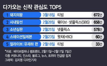 다가오는 신작 관심도 순위에선 국내 OTT가 선방했다. 1위를 차지한 연상호 감독의 티빙 오리지널 '돼지의 왕'은 연쇄살인 사건 현장에 남겨진 20년 전 친구의 메시지로부터 '폭력의 기억'을 꺼내게 된 이들의 이야기를 담은 추적 스릴러다. 연 감독의 동명 장편 애니메이션이 원작이며, 김동욱(황경민 역)·김성규(정종석 역)·채정안(강진아 역) 등의 캐스팅 라인업으로 눈길을 모은다. '돼지의 왕'은 오는 3월18일 티빙에서 단독 공개된다.