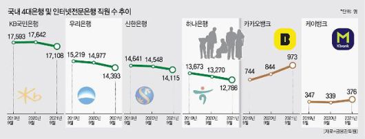 반면 인터넷전문은행의 직원 수는 늘고 있다. 2019년 9월 카카오뱅크 직원 수는 744명에서 2020년 9월 844명, 2021년 9월 973명으로 매년 100명가량 증가했다. 같은 기간 케이뱅크 직원 수는 347명에서 376명으로 소폭 늘었다.