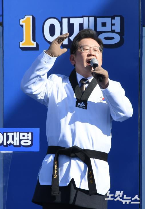 수원 유세에 나선 더불어민주당 이재명 대선 후보가 20일 오전 경기 수원 장안구 만석공원 유세차량에 올라 지지를 호소하고 있다.