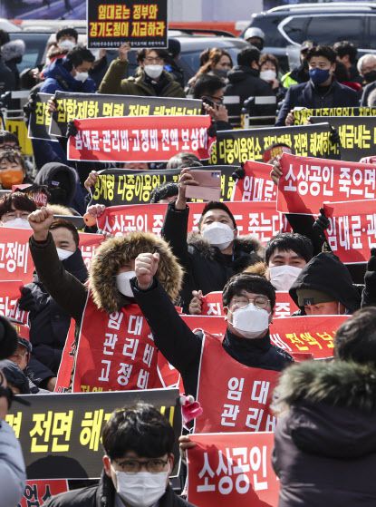 지난 15일 서울 광화문 열린마당에서 열린 ‘코로나 피해 실질 보상 촉구 및 정부 규탄대회’에서 자영업자들이 구호를 외치고 있다. (사진=연합뉴스) |