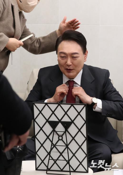 방송 광고촬영과 토론준비로 공개일정을 잡지 않은 국민의힘 윤석열 대선 후보가 20일 서울 중구의 한 방송사 스튜디오에서 광고 촬영을 준비하고 있다.