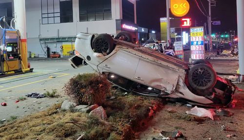 (청주=연합뉴스) 천경환 기자 = 20일 오후 10시 30분께 충북 청주시 청원구 사천동 도로에서 승용차가 가로등을 들이받고 전복되는 사고가 발생했다.