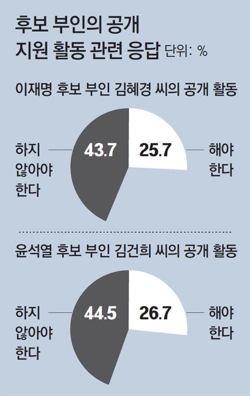 3·9대선 공식 선거운동이 시작된 지 일주일가량 흘렀지만 더불어민주당 이재명 후보의 부인 김혜경 씨와 국민의힘 윤석열 후보의 부인 김건희 씨는 모두 공개 행보를 하지 않고 있다. 20일 동아일보 3·9대선 여론조사 결과 김혜경 씨와 김건희 씨가 공개적인 선거 지원 활동에 나서는 것에 부정적인 시각이 많았다.